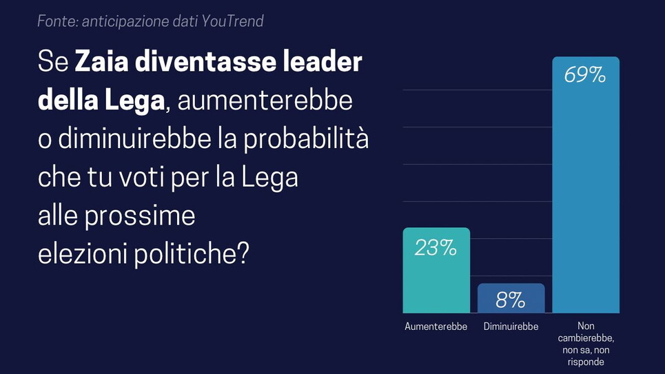 Qualora l'ex presidente del Veneto diventasse leader del Carroccio le probabilità di votare Lega alle elezioni politiche aumenterebbero del 23 per cento, dicono gli intervistati. Anche perché riuscirebbe a conquistare voti anche nel campo largo. E supera Salvini e Vannacci per indici di fiducia