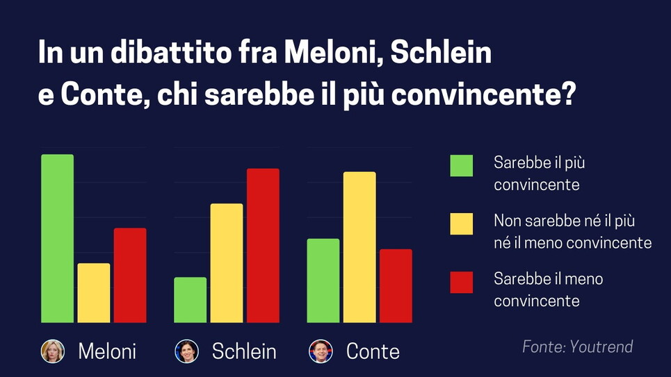 Primo dato: Meloni è ritenuta più convincente di Schlein e lo pensa quasi un italiano su due (il 48 per cento). Secondo: Schlein nell’eventuale duello diretto con Meloni risulta la meno convincente (è l’opinione del 44 per cento degli intervistati). Terzo, Conte se la sarebbe cavata meglio ma non è trainante come si pensi. Cosa c’è di meglio che smentire i sondaggi, gli oroscopi?