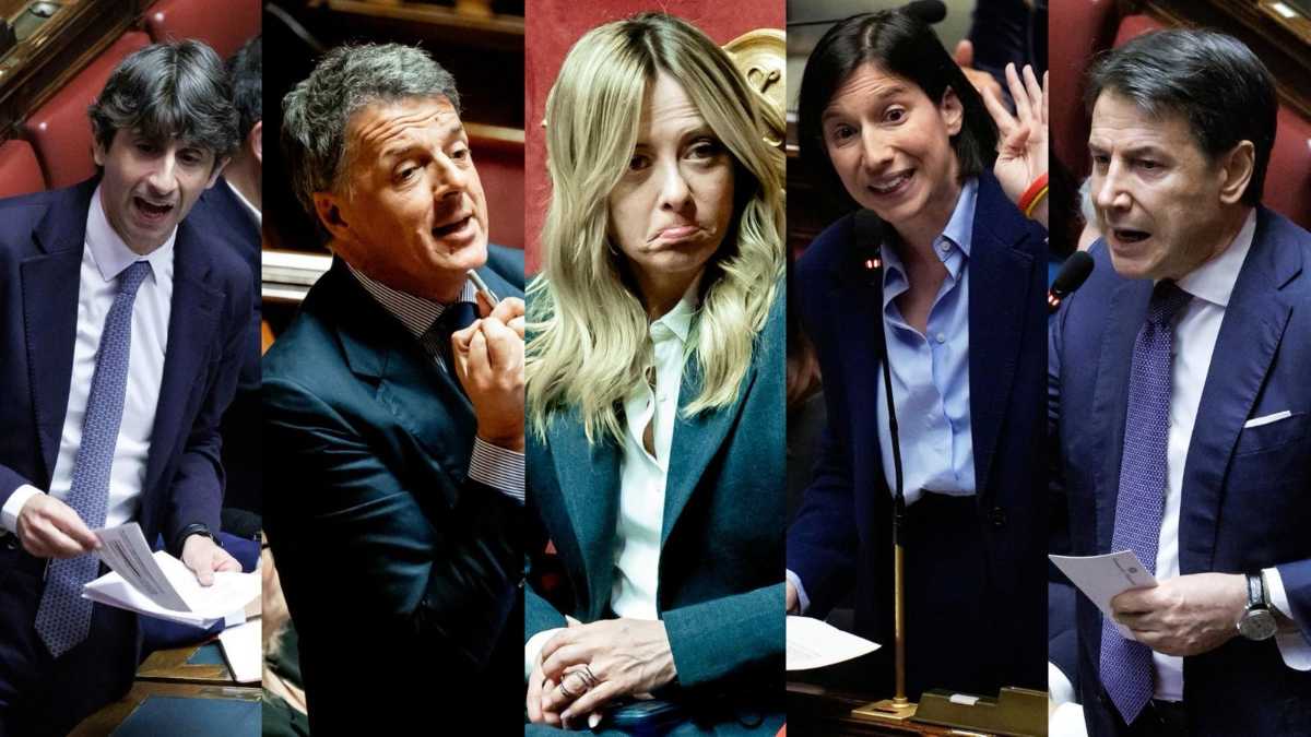 Giovanni Donzelli, Matteo Renzi, Giorgia Meloni, Elly Schlein e Giuseppe Conte – foto LaPresse