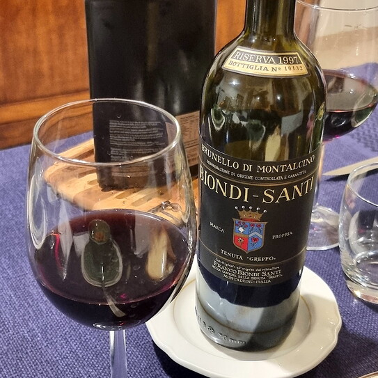 La bottiglia è un Brunello di Montalcino del 1997, ai tempi cantavano Dalla, De André, Battiato. Tutti morti. In 24 anni il mondo si è come disintegrato, ma quel vino nel bicchiere si dimostra incolume, imperturbabile