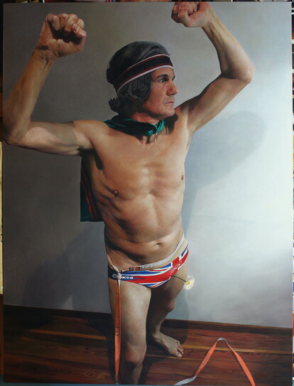 Negli stessi giorni dell’Impiccato esposto in un prestigioso cesso di Milano (il nichilismo di Cattelan è caricaturale), Moro ha dato l’ultima pennellata al suo autoritratto, “Questo sono io”: tela autoironica ma senza cinismo, virtuosa ma senza accademismo, in cui campeggia un cinquantenne indomito, inesausto che, bandana, torso nudo e fiore nello slip, si allena per continuare a partecipare alla festa della vita. Un Moro scatenato contro la necrocultura, contro i beghini e i becchini del sistema necrofilo dell’arte: sia il campione di chi non ha nessuna intenzione di suicidarsi per conformarsi.