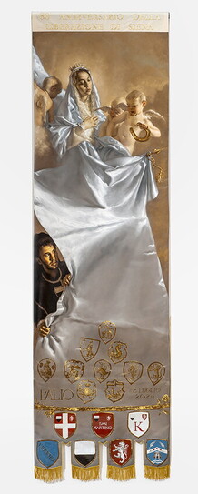 Madonna di Provenzano, finalmente ti hanno trovato il pittore giusto. Negli ultimi decenni, per il tuo drappellone, a Siena, ti avevano affibbiato pittori soltanto bravi, pittori soltanto devoti o, ancora peggio, pittori né bravi né devoti. Nel 2010 fu il turno perfino di un maomettano. Ovvio che a sfogliare la storia del Palio del 2 luglio si vedano tanti drappelloni brutti e tanti drappelloni profani. Stavolta, grazie a Giovanni Gasparro, invece è andata bene. Molto bene. Come scrive il senese Antonio Socci “nel tempo della scristianizzazione e delle avanguardie pittoriche, Gasparro è un sovversivo per due motivi: la sacralità dei soggetti e la scelta figurativa, caratterizzata da una vigorosa fisicità”. Madonna di Provenzano, dopo tanti pittori capaci di relegarti in un angolo come fossi un reperto, o un fastidio, l’eccellente pittore pugliese, campione dell’arte sacra, ti ha reso di nuovo protagonista: giovane, bella, vera, e in posizione dominante. Così tutti vedranno che il Palio non è una qualsiasi corsa di cavalli ma una festa tua. Oggi in Piazza del Campo.