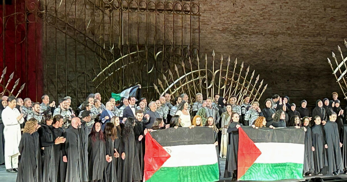 Bandiere palestinesi al termine del Macbeth allo Sferisterio di Macerata (Ansa)