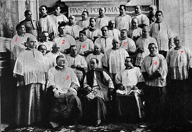 Il coro della Cappella Sistina fotografato il 4 marzo 1898 in occasione del ventesimo anniversario dell'incoronazione di papa Leone XIII. Sono presenti i castrati: 1 Giovanni Cesari. 2 Domenico Salvatori. 3 Domenico Mustafà. 4 Alessandro Moreschi. 5 Vincenzo Sebastianelli. 6 Gustavo Pesci. 7 Giuseppe Ritarossi.