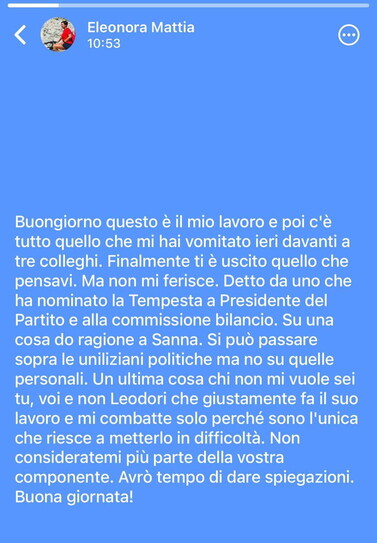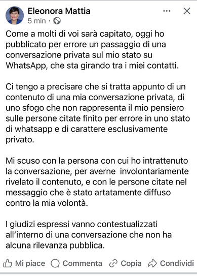 La consigliera regionale Eleonora Mattia pubblica per errore sullo status di Whatsapp un messaggio il cui destinatario è ignoto, ma nel Pd sono tutti convinti: "Era per Claudio Mancini". Nel messaggio si legge: "Non è Leodori che non mi vuole, siete voi. Non consideratemi più parte della vostra componente". La consigliera sognava di diventare la nuova presidente del Pd laziale