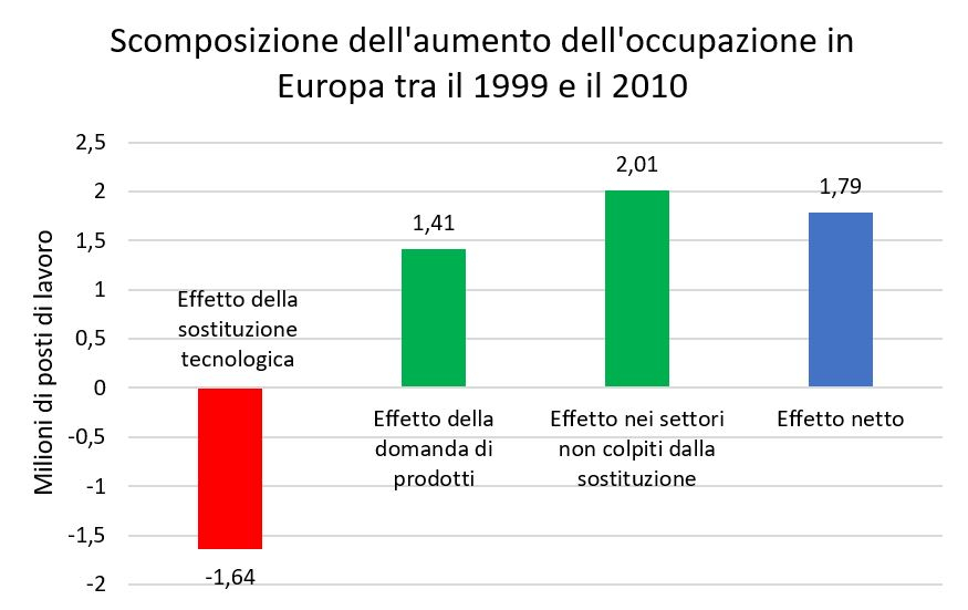 La più recente ricerca sul tema, degli economisti Gregory, Salomons e Zierahn, osserva più nel dettaglio i movimenti del mercato del lavoro in Europa, avvenuti tra il 1999 e il 2010, per capire se fino a oggi l’uomo ha gareggiato fianco a fianco, o contro le macchine. Da allora secondo lo studio 1,64 milioni di posti di lavoro sarebbero stati sostituiti da un macchinario o un algoritmo, ma allo stesso tempo in quegli stessi settori colpiti dalla sostituzione si sono creati altri 1,4 milioni di posti di lavoro per via dell’aumento della produttività, e più di 2 milioni ulteriori in altri settori, sempre grazie alla tecnologia. L’effetto netto quindi, per i ricercatori, è stato un aumento di 1,8 milioni di posti di lavoro in Europa: una crescita che però pone un problema per la sua distribuzione, poiché la maggior parte dei nuovi lavori non viene occupato da chi lo ha perso.