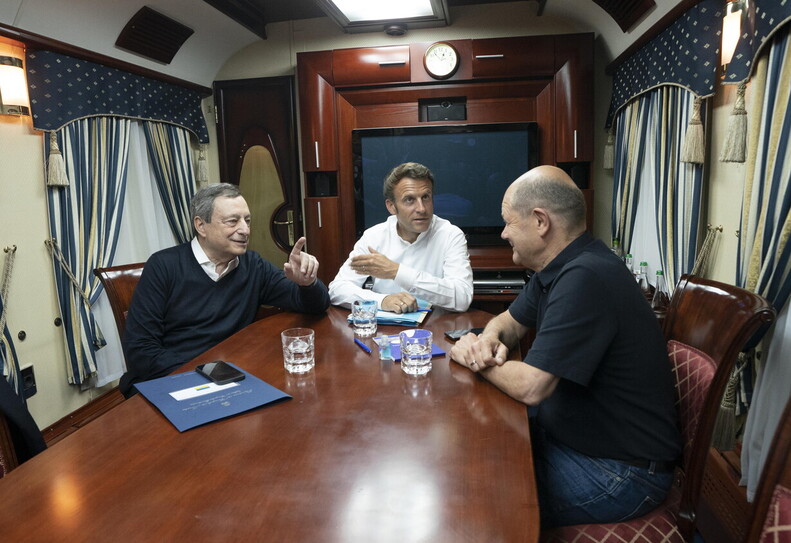 Il cancelliere Scholz ha detto al quotidiano tedesco Bild che, con il loro viaggio, i tre leader "vogliono mostrare non solo solidarietà, ma anche assicurare che l'aiuto che stiamo organizzando - finanziario, umanitario, ma anche per quanto riguarda le armi - continuerà". A bordo del treno che li ha portati a Kyiv dalla Polonia, i leader europei hanno avuto un vertice di circa due ore.