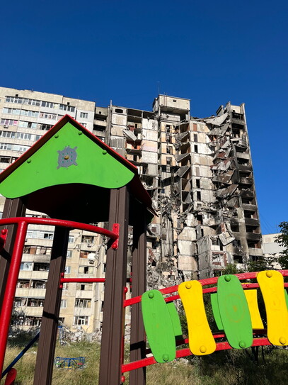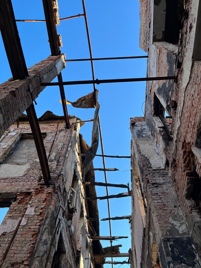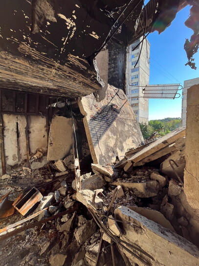 Da Saltyvka la linea di contatto si raggiunge con appena mezz’ora di macchina e quest’area è esposta non solo al tiro dei missili ma anche a quello dell’artiglieria. Dentro ai palazzi si trovano resti di vita quotidiana completamente anneriti: la rete di un materasso, un salvadanaio con ancora dentro delle monete, un frigorifero ridotto ad ammasso di lamiere. Mentre parla ogni tanto Mikhailo si interrompe per ascoltare le esplosioni che si sentono in sottofondo: “M777”, dice a un certo punto. In questo caso sono colpi in uscita da parte degli obici da 155mm donati dagli americani.