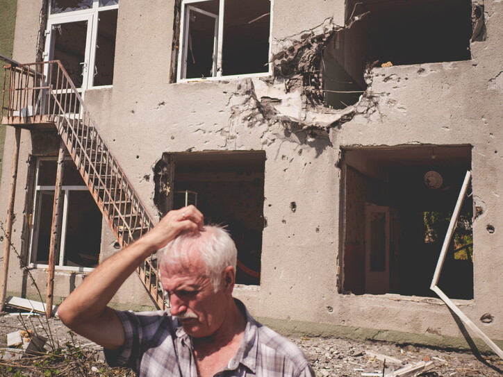 Davanti al portone di uno dei caseggiati ancora abitati una quarantina di persone si raduna per il pranzo, ciò che rimane della comunità di Stepnog’irsk è quasi tutto qui, raccolto attorno a un tavolaccio a mangiare i piroshki di Natalya mentre lei con le mani unite e gli occhi puntati verso il cielo prega, in russo, che i russi se ne vadano via dalla sua terra. Al pranzo si è unito anche Vitaly, il bidello dell’asilo del villaggio, ormai deserto da mesi. Un missile l’ha centrato a metà luglio lasciando un buco circolare nella parete che separa le aule ancora tappezzate di disegni bruciacchiati.