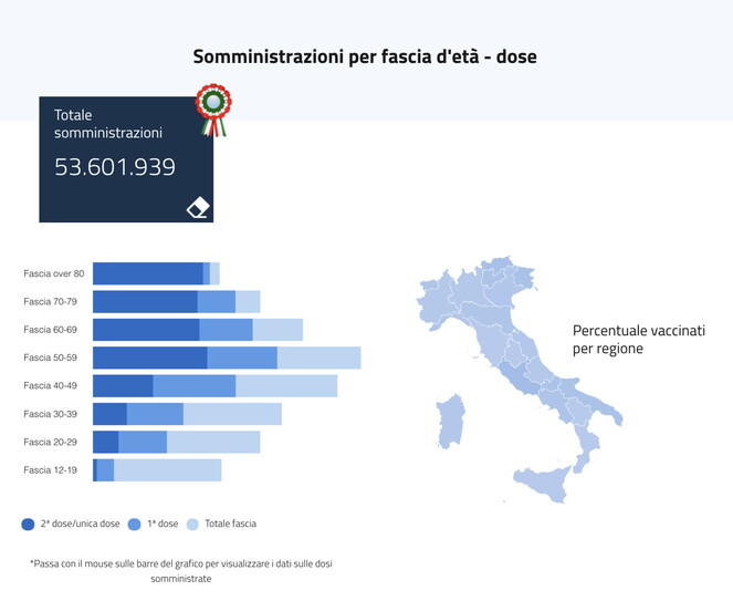 Secondo il report del governo, risultano completamente vaccinati 20.097.184 di italiani, ovvero il 37,21 per cento della popolazione over 12, con l'89,9 per cento delle dosi disponibili che sono state effettuate (53.601.939 su 59.622.714). Tuttavia le preoccupazioni riguardano gli over 60, in questa fascia d'età sono 6.577.186 le persone che devono ancora completare il ciclo di vaccinazioni, è su di loro che la struttura commissariale dovrà concentrarsi nelle prossime settimane.