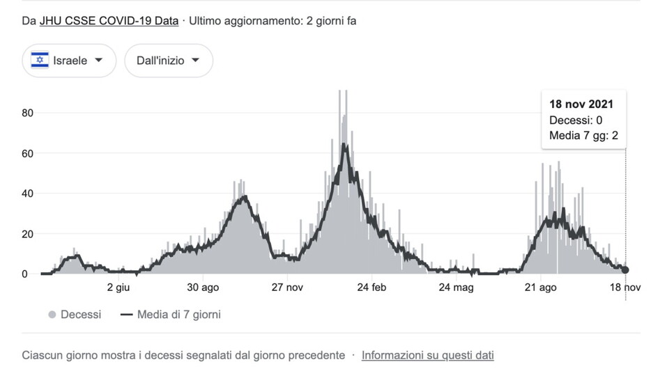 La terza dose ha messo fine alla quarta ondata (quella della variante delta) vissuta da Israele a partire da questa estate. Ieri, per la terza volta in una settimana, nello stato ebraico sono stati registrati zero decessi da Covid. Il paese, primo in occidente ad aver iniziato la campagna vaccinale quasi un anno fa, è un laboratorio che anticipa le tendenze rispetto ai dati sull’efficacia vaccinale.
