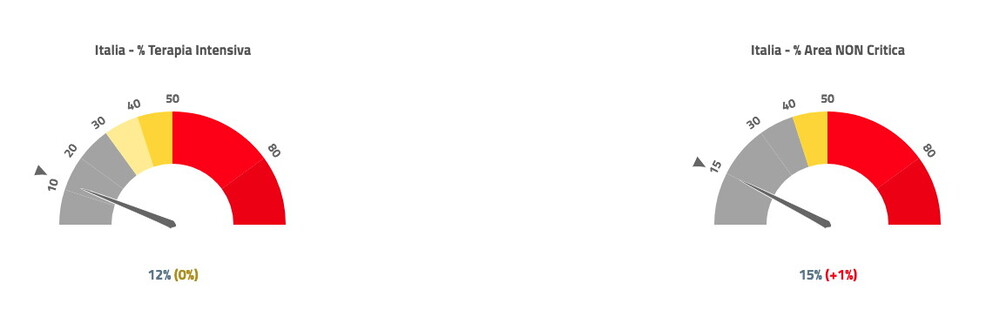 Considerando i due principali riferimenti, terapie intensive e ricoveri, ben 9 regioni raggiungono o superano contemporaneamente i limiti di guardia del 10 e 15 per cento, con le maggiori preoccupazioni che riguardano la Calabria (16 e 28 per cento), il Friuli-Venezia Giulia (17 e 22 per cento), Liguria (19 e 27 per cento), Marche (15 e 21 per cento) e la provincia autonoma di Trento (22 e 18 per cento). Ma la situazione viene monitorata attentamente anche nel Lazio (14 e 15 per cento), a Bolzano (15 e 19 per cento), in Piemonte (14 e 17 per cento) e Veneto (16 e 18). Con il rischio concreto che, con l'anno nuovo, l'Italia torni a colorarsi di arancione, anche per effetto delle festività natalizie e delle ulteriori occasioni di contagio.
