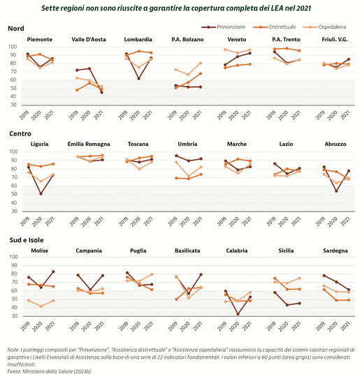 Questi tre dati indicano che spendiamo per la sanità meno della media degli altri paesi dell’Unione europea. Che la quota di spesa diretta, quella pagata direttamente dagli utenti della sanità, in Italia è di 7 punti più alta della media dei paesi europei (quindi che la sanità pubblica non riesce a coprire una parte cospicua della spesa e costringe i privati a pagare le cure sanitarie di tasca propria). Infine, che vi sono forti divari nella sanità tra le regioni perché quasi la metà (sette regioni su venti) non garantisce la copertura completa dei livelli essenziali di assistenza fissati in sede nazionale per assicurare l’eguaglianza di trattamento dei cittadini.