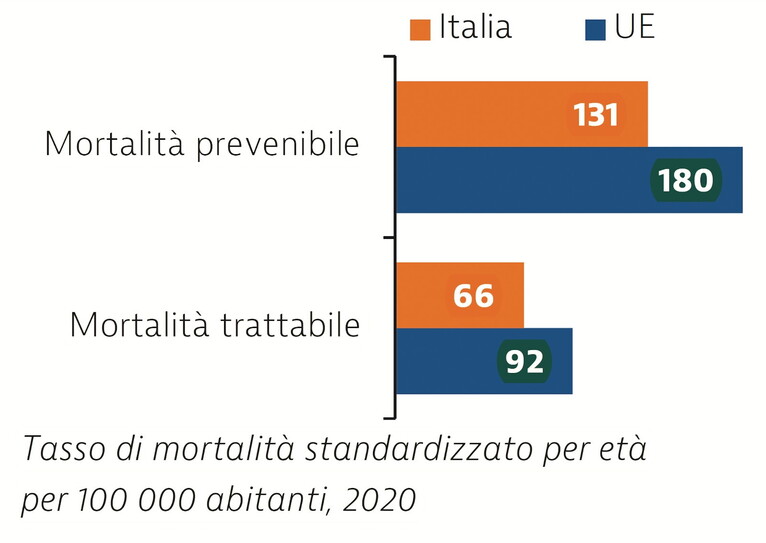 Dal “profilo” emerge che il Servizio sanitario italiano ha dato un contributo fondamentale al benessere dei cittadini. La speranza di vita alla nascita degli italiani è superiore di 2,3 anni alla media europea. I tassi di mortalità prevenibile e trattabile sono tra i più bassi tra i paesi europei. La percentuale di italiani che dichiara bisogni di assistenza sanitaria non soddisfatti è più bassa rispetto alla media europea. Inoltre, la sanità è uno dei comparti più numerosi del settore pubblico perché vi lavorano quasi 700.000 persone, numero inferiore solo al comparto della scuola.