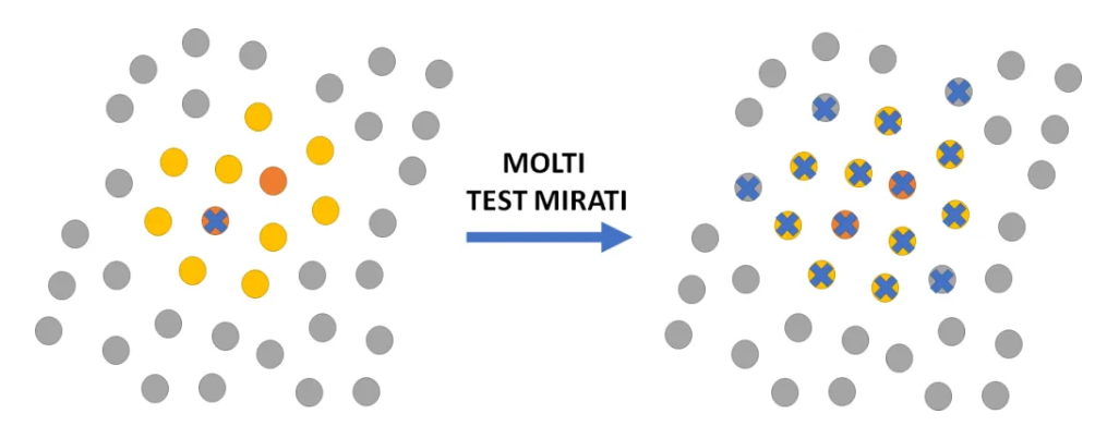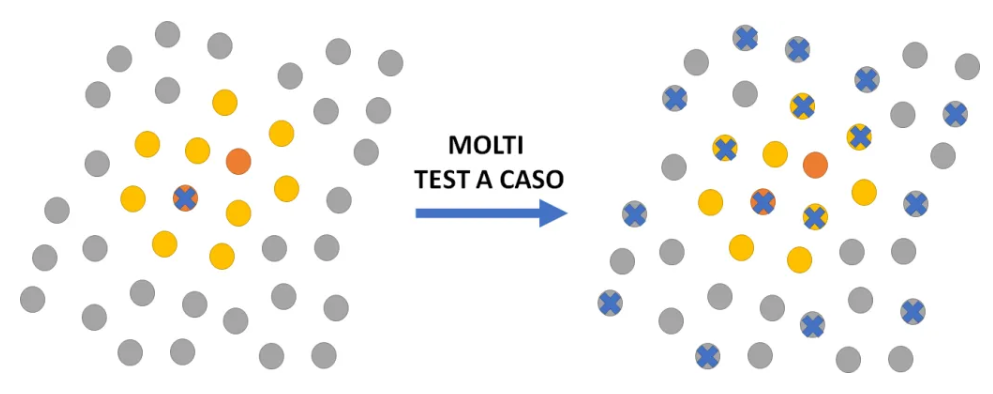 Nel primo caso, illustrato dalla figura qui sotto, applichiamo un gran numero di test sulla popolazione, utilizzando una distribuzione casuale per avere un campione statistico. Dalla percentuale di positivi al test otteniamo al più una rappresentazione statisticamente corretta della frequenza del virus nella popolazione, ma non identifichiamo tutti i soggetti infetti.