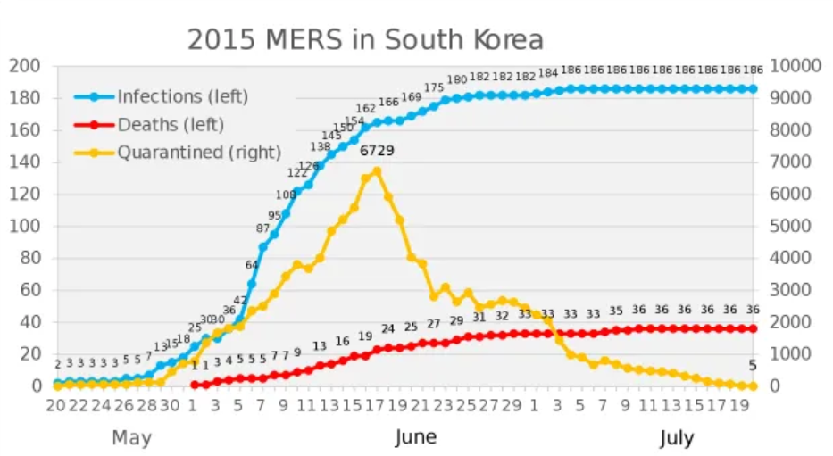 Facciamo un passo indietro: nel 2015, la Corea dovette affrontare uno scoppio epidemico di un altro coronavirus, quello che causa la MERS, a partire da un paziente proveniente dall’Arabia Saudita che era stato ospedalizzato. L’andamento di quell’epidemia è rappresentato qui sotto: si nota come ci fu una letalità di circa il 20% e la quarantena di migliaia di persone.