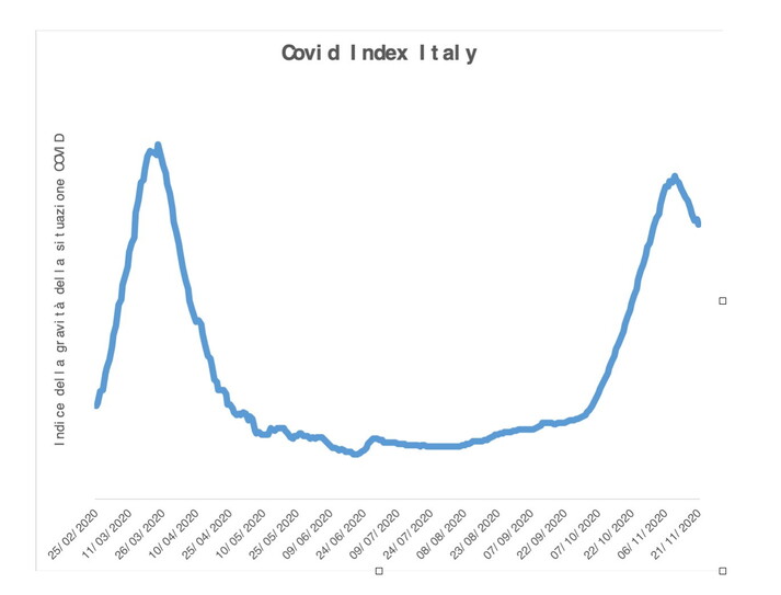 I dati restituiscono un pattern sulla forza del virus, se così vogliamo chiamarla. Non ha una valenza predittiva, ma descrittiva. Per i più curiosi, il retroterra logico usato da Zenti attinge anche al teorema di Bayes, geniale matematico britannico del Settecento. Il Covid Index (più il valore è elevato, peggio siamo messi) ci mostra come la cosiddetta seconda ondata sia solo di poco meno grave della prima. Fatto 100 il valore base alla data del 25 febbraio 2020, il picco si è raggiunto il 24 marzo, giorno nel quale l’indice era pari a 389 punti: il 10 novembre il valore ha raggiunto 341 punti. E’ chiaro dunque che ci troviamo comunque in una situazione critica.