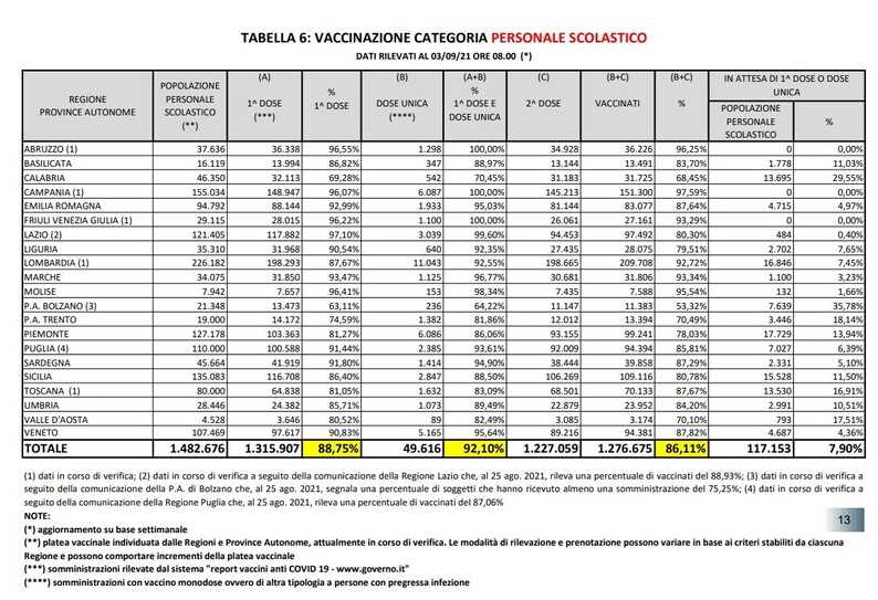 Mentre oltre il 71 per cento della popolazione italiana over 12 risulta ormai del tutto immunizzata, a tenere banco è la questione relativa al personale scolastico, che potrà prestare servizio solo se in possesso di green pass. Secondo gli ultimi dati sono 117 mila circa a non essere ancora vaccinati, il 7,9 per cento della categoria, su un totale di 1.482.676 persone.