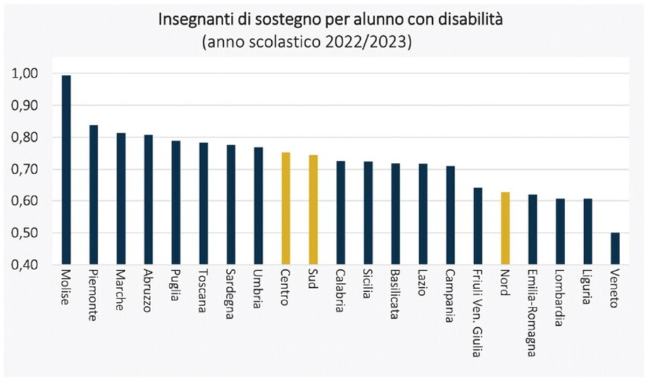 Si parla tanto del divario Nord Sud, ma vi sono tanti altri divari, ed uno di questi emerge dall’indagine dell’Osservatorio sui conti pubblici italiani, che mostra un dato che stupisce. Molise e Piemonte sono accomunati nel ricorso agli insegnanti di sostegno: ne hanno quasi uno per ognuno degli studenti con disabilità.