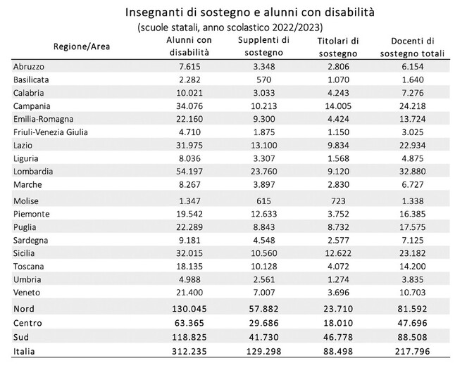 A loro volta, gli insegnanti di sostegno sono 217.796 e in 10 anni hanno registrato un aumento del 163 per cento. Se si valuta che il numero totale degli insegnanti delle scuole statali è di circa 900.000, si può dire che circa un quarto è costituito dagli insegnanti di sostegno.