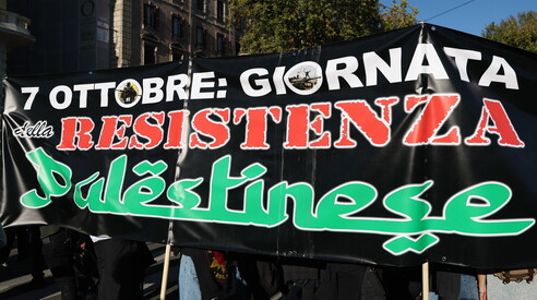 Il 7 ottobre come atto di resistenza: sabato a Roma è comparso anche questo striscione (foto Ansa)