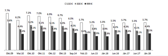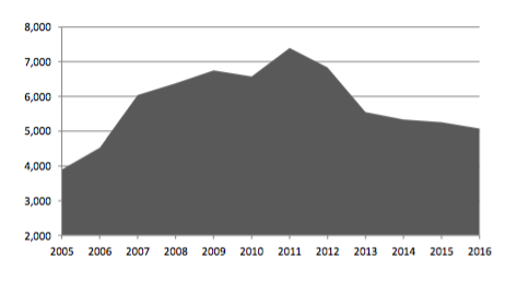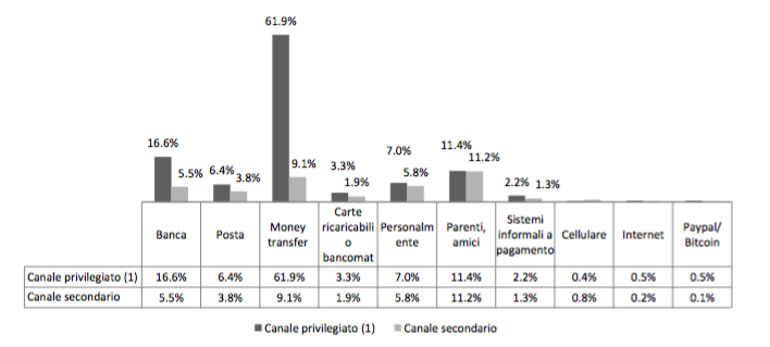 Andamento flussi rimesse dall’Italia – Serie storica (milioni di Euro). Fonte: Osservatorio Nazionale sull’Inclusione Finanziaria dei Migranti in Italia, VI rapporto 2017