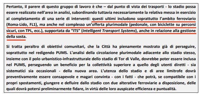 Può la rete reggere i flussi aggiuntivi nel caso in cui le linee ferroviarie FL1 e Roma-Lido non fossero debitamente e preliminarmente potenziate (anche per iniziare gradualmente a fidelizzarne l’utenza), dovendo quindi sostenere un ulteriore 30 per cento degli indotti la mattina o 50 per cento in caso di evento sportivo la sera?”, si chiedono i docenti del Politecnico nella relazione finale. “Una diagnosi come quella uscita nei primi di dicembre dal Comune è completamente compresa nella relazione finale, praticamente tale e quale – ha ammesso Della Chiara – Il problema c’è e rimane, ma si risolve. La rete viaria romana è già carica. E oggi si parla di offerta di trasporto plurimodale. Le stazioni Tor di Valle e Magliana devono essere realizzate in tempi contenuti. Nella misura in cui queste azioni verranno attuate prima della messa in esercizio dello stadio potranno garantire al tifoso di non utilizzare esclusivamente l’auto. Queste azioni che abbiamo rafforzato vanno attuate in tempi contenuti”. “Sulla Roma-Lido stiamo già lavorando con la Regione Lazio. Hanno già 180 milioni per l’ammodernamento delle strutture”, precisa la sindaca. Senza spiegare però che quei soldi, fermi da tempo, serviranno per i lavori su tutti i 30 chilometri e le tredici stazioni dell’intera tratta.