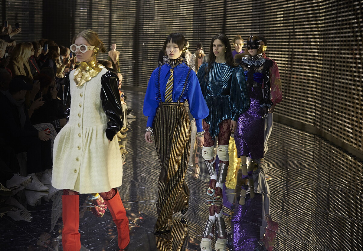 Annunciata dalla maschera in papier maché di un ermafrodito di ispirazione romano-ellenista, singolare invito agli ospiti a riflettere sulla natura della propria “persona”, cioè del sé e del proprio doppio nascosto, la sfilata Gucci autunno-inverno 2019-2020 apre su un forte latrare e ringhiare di cani, prosegue sulle note della corale The angel Gabriel (“from heaven came, With wings as drifted snow, with eyes as flame”, che venne dai cieli con le ali come di neve e gli occhi di fiamma) e porta in passerella decine di giovani lord dal volto protetto da maschere di lattice, collier de chien con borchie, bretelle ricoperte di spunzoni e ladies dalle giacche appena oversize tacchi altissimi ai piedi e sneaker portate a mano come la “donna in carriera” Melanie Griffith dei tempi che furono, pronte a scappare.