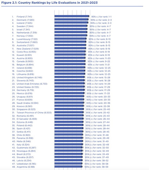 Ciò non toglie validità all’indagine. Sia perché la felicità percepita sembra accompagnarsi costantemente al grado di prosperità e libertà di una nazione (in Afghanistan e in Libano sono tristissimi), lasciando intendere che la percezione sia almeno in parte condizionata da fattori concreti; sia perché la percezione della felicità è essa stessa la felicità. Una persona che si sente infelice nelle condizioni ideali per essere felice è una persona infelice comunque.