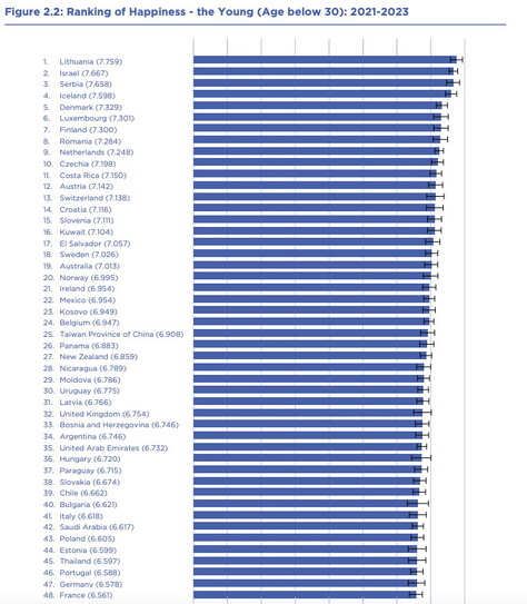 A questa luce va analizzato il dato più clamoroso di quest’anno: gli Stati Uniti, nazione fondata sul diritto alla ricerca della felicità, sono usciti dalla top 20, e del tracollo sono in larga parte responsabili i giovani. Se infatti gli Usa fossero abitati soltanto da ultrasessantenni, sarebbero al decimo posto della hit parade; se fossero abitati solo da persone fino ai trent’anni, galleggerebbero più o meno a metà della graduatoria delle 143 nazioni su cui è stata effettuata la ricerca. Dati alla mano, tanto varrebbe vivere in Honduras.