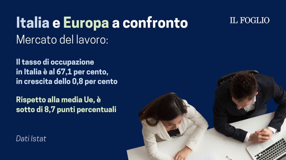 Rispetto all'Unione europea, l'Italia presenta un tasso di occupazione (al 67,1 per cento) più basso di 8,7 punti percentuali. In realtà, nel 2024, il tasso di occupazione in Italia tra i 20 e i 64 anni continua a crescere, +0,8 punti percentuali. Non solo, si riduce il lavoro a tempo determinato e cresce l'occupazione delle donne con figli tra 0 e 5 anni (+1,8 per cento). Cala lo smartworking: la quota di occupati che hanno lavorato da casa nelle quattro settimane precedenti l'intervista scende dal 12 percento del 2023 al 10,3 per cento del 2024, sono circa 2,5 milioni di persone, -360mila rispetto all'anno precedente. Infine, gli italiani si sentono più sicuri sul posto di lavoro, si riduce infatti la quota di chi ritiene probabile perdere il lavoro entro sei mesi e improbabile trovarne uno simili (dal 4,1 per cento nel 2023 al 3,2 per cento nel 2024).
