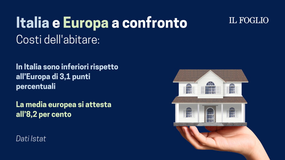 Il sovraccarico del costo dell'abitazione indica la situazione in cui una famiglia o una persona spende una quota troppo alta del proprio reddito per l'abitazione, cioè affitto o mutuo più le spese collegate (condominio, bollette, tasse locali). L'Italia è sotto di 3,1 punti percentuali rispetto alla media europea (8,2 per cento). Ciò avviene anche per gli indicatori relativi alla deprivazione materiale e sociale e alla difficoltà ad arrivare a fine mese.
