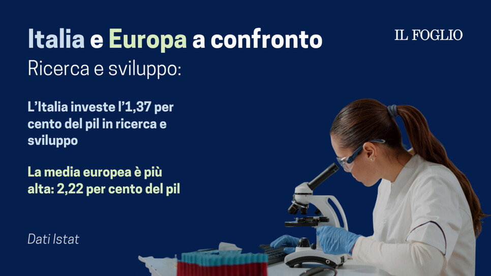 L'Italia investe meno in ricerca e sviluppo rispetto all'Europa: l'1,37 per cento del pil, contro una media del 2,22 per cento. Anche la percentuale di lavoratori con formazione universitaria nelle professioni scientifiche-tecnologiche è inferiore di 7,4 punti in confronto alla media europea. Rispetto al 2014, l'intensità di ricerca registra un aumento modesto, dall'1,33 all'1,37 per cento del pil, con un impegno crescente delle imprese, che passano dallo 0,75 per cento del pil allo 0,80 per cento nel 2023.