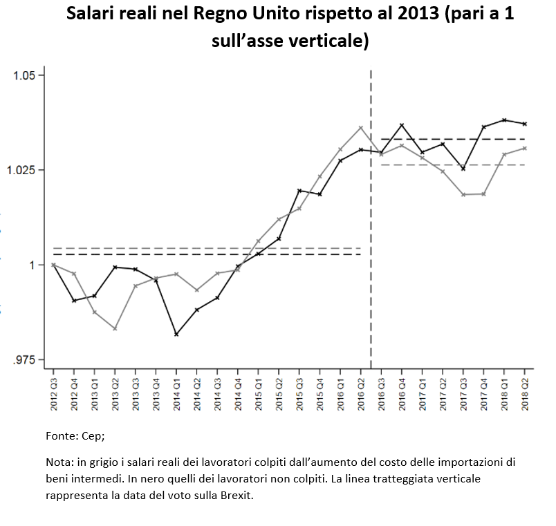 Lo studio del Cep ha inoltre dimostrato che le aziende inserite nei settori colpiti dalla svalutazione e dunque dall’aumento dei beni e servizi intermedi hanno anche ridotto gli investimenti in formazione aziendale dei propri dipendenti. Questo tipo di spesa è particolarmente importante per aumentare gli stipendi futuri dei lavoratori, incrementando la loro produttività. Si tratta inoltre di un elemento fondamentale per superare le difficoltà che alcuni lavoratori espulsi dal mercato del lavoro riscontrano per via della globalizzazione, in modo da avviare la transizione verso settori più qualificati. Ciò significa che il tentativo di uscita del Regno Unito dall’Unione europea produrrà effetti negativi anche sulla condizione economica futura dei lavoratori coinvolti oggi.