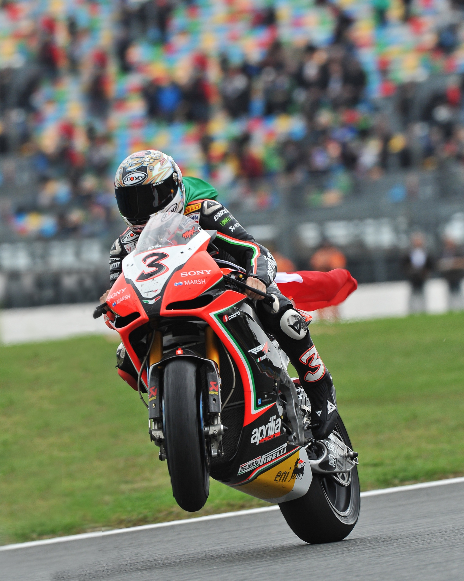 Max Biaggi in sella all'Aprila RSV4 con cui ha vinto il Mondiale Superbike nel 2012