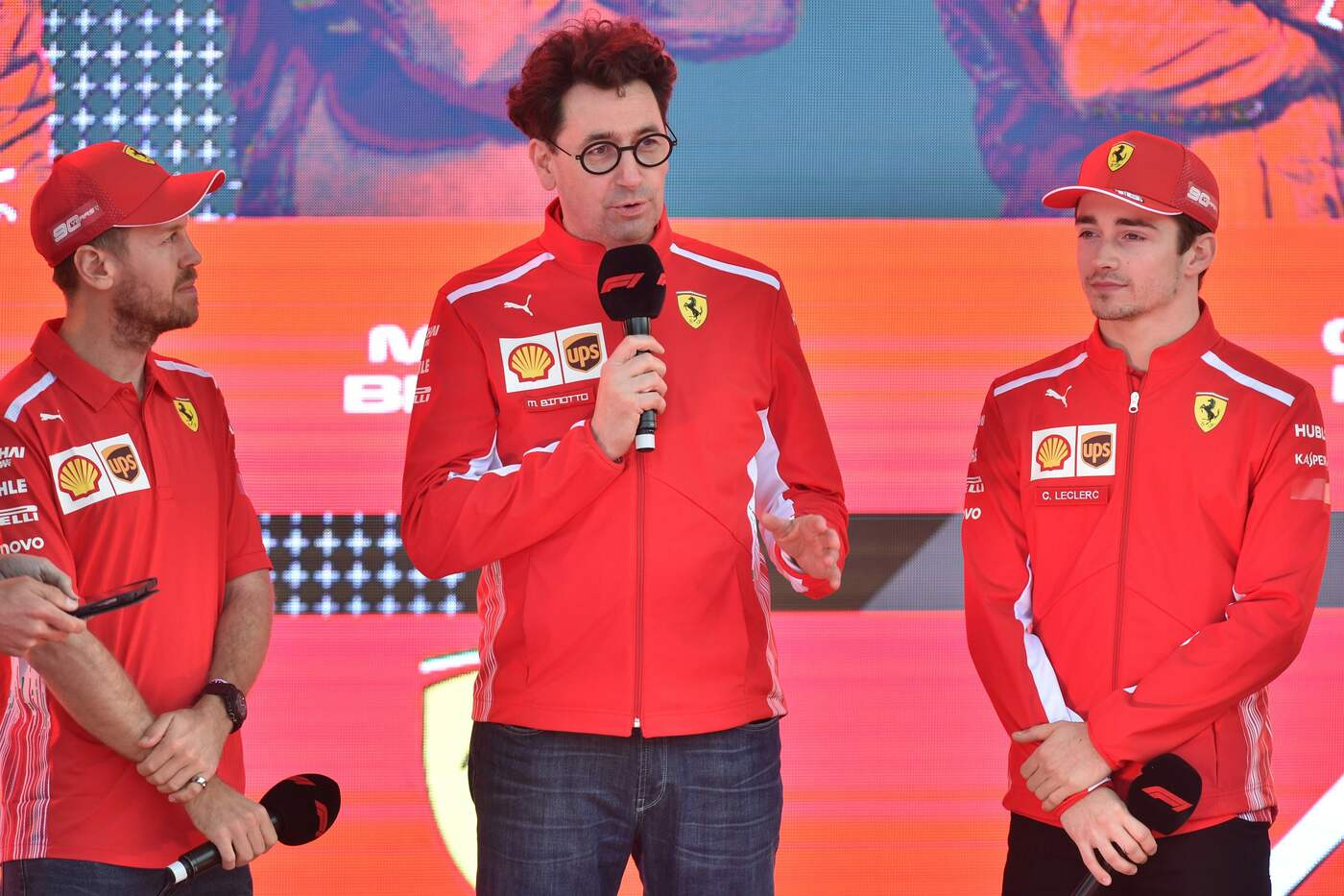 Da sinistra Sebastian Vettel, Mattia Binotto e Charles Leclerc (foto LaPresse)