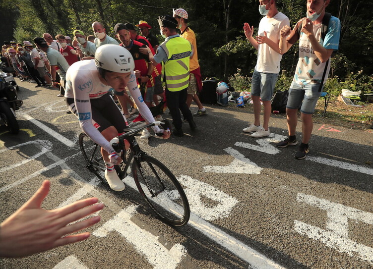 Tadej Pogačar una volta superato lo striscione d’arrivo in cima a La Planche des Belles Filles c’ha messo quasi un centinaio di metri a fermarsi. Ha schivato i fotografi, un commissario di percorso, pure i membri non pedalanti della sua squadra, il Team UAE Emirates. Ha scosso un paio di volte la testa, ha sorriso e sbuffato. Poi ha ingrossato la cassa toracica in cerca d’ossigeno, ha espirato, sempre tenendo la testa bassa, come se tutto il resto non esistesse, come se si volesse concedere un momento per sé. O forse solo per farsi un po’ rincorrere, ché a cronometro nessuno ti insegue davvero, voltarsi non ha senso, se qualcuno sopraggiunge da dietro ce se ne accorge facilmente e anche ben prima che questo arrivi: sono le gambe ad avvisare. In una cronometro non si scappa da niente, non ci sono allunghi da fare, al massimo si accorcia: lo spazio, il tempo, la sofferenza. Tadej Pogačar ha abbassato il capo sul manubrio mentre la sua cassa toracica continuava a muoversi su e giù. Quando ha rialzato la testa si è guardato attorno senza guardare nulla. L’accorciamento era finito davvero. Doveva capire solo una cosa, che non era per nulla marginale, se l’avevano preso in giro dall’ammiraglia, se quello che aveva sentito, tutto quell’entusiasmo che aveva percepito attorno a lui nelle ultime centinaia di metri prima del traguardo era o meno giustificato dalla realtà.