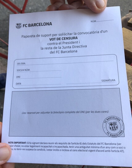 In poco più di due settimane sono state raccolte e, successivamente, validate 3mila firme in più delle 16.520 necessarie (il 15 per cento dei soci aventi diritto di voto) per la celebrazione del voto di sfiducia a Bartomeu e a tutta la Junta Directiva: un referendum che vedrebbe la giunta decadere con il 66 per cento dei voti favorevoli.