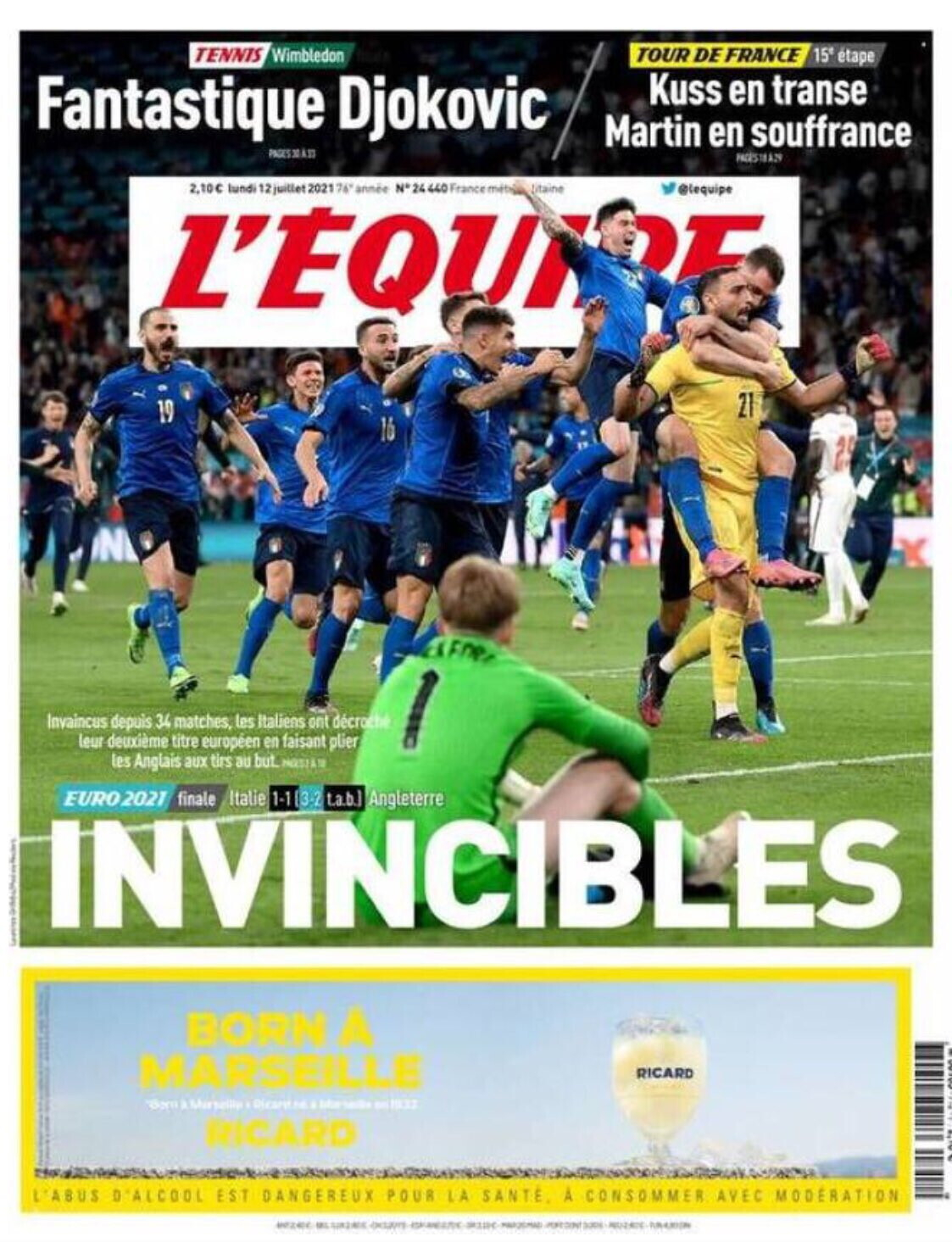 Foto grandi un pagina, gioia o disperazione a seconda del soggetto ritratto, a seconda della scelta di campo: vincitori o sconfitti. Scegliere è possibile quando non si è parte in causa della finale di Euro 2020, perché per Italia e Inghilterra questa era obbligata: da una parte chi ha vinto, gli Azzurri di Mancini, dall'altra parte chi ha perso, gli inglesi di Southgate.