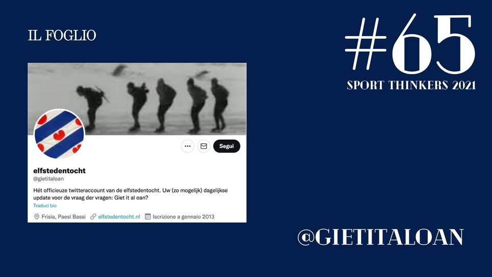 65) @Gietitaloan, profilo Twitter, Olanda. Perché, ogni giorno, scandisce l’attesa messianica per l’Elfedenstocht, la mitica corsa di pattinaggio sui canali ghiacciati delle città della Frisia che, per ragioni climatiche, non si disputa dal 1997 (e che a febbraio sembrava sul punto di potersi nuovamente disputare, ma il Covid-19 avrebbe bloccato tutto… beffa evitata!)