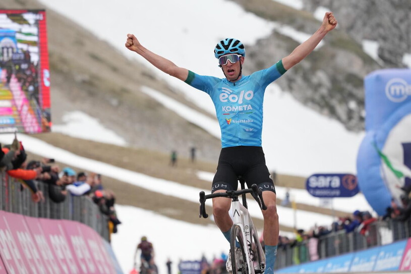 Davide Bais è un gran bel corridore, uno di cuore, uno che non ha paura di rischiare la mattata, perché è perfettamente consapevole che in gruppo ce ne sono molti che sono più veloci di lui, che hanno più scatto di lui, che in salita sono più abili di lui. Davide Bais lo sa e fugge appena può da loro. Il ciclismo è l’unico sport nel quale fuggire è un atto di coraggio e Davide Bais ha sempre dimostrato di averne a pacchi. Ha pedalato migliaia e migliaia di chilometri con il gruppo alle calcagna. Questa vittoria ripaga di tutte le altre volte andate male. Domani coprirà la sua maglia dell’Eolo-Kometa con quella blu di miglior scalatore. Altro premio alla perseveranza.