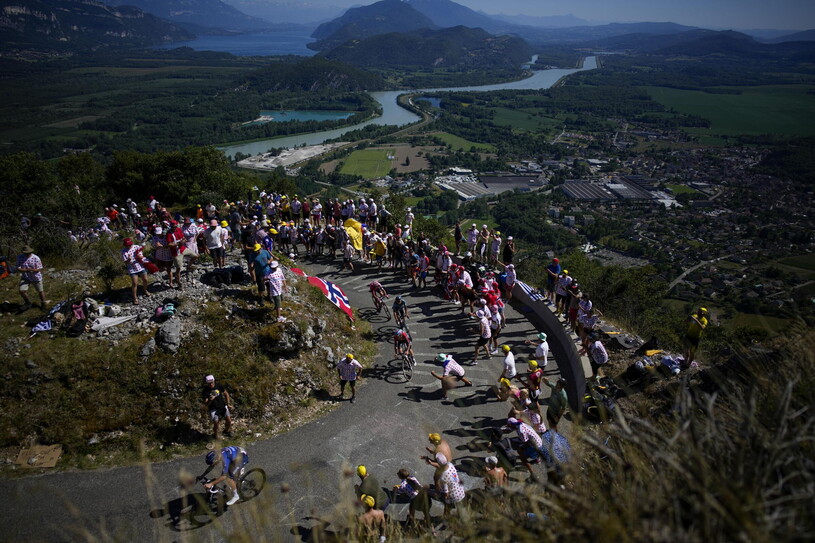 È un atto di generosità il tornante. Per chi pedala, perché se preso all'esterno concede un attimo di fiato – ma vale solo per i brocchi, che ai campioni non serve, vanno su e forte sempre – lenendo, un poco almeno, la fatica dell'ascendere. Per chi guarda, perché si vede a lungo e pure di sotto, se si è nel punto giusto, se la salita lo concede. Il Grand Colombier concede, è esibizionista: un panettone enorme con attorno niente. Non poteva essere esibizionista pure la sua strada, almeno quella che sale da Culoz: si fa ammirare da lontano e dall'alto, con quei Lancets posti in favor di sole e telecamera.