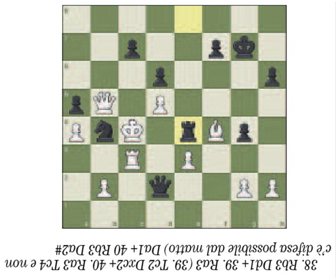37… Te4+. Posizione finale dell’ultima partita tra i due contendenti al titolo mondiale. In parità di materiale, il B. abbandona: il matto è inevitabile. Riesci a vederlo?