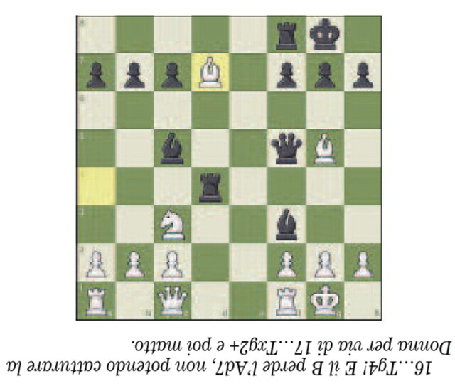 Il Bianco gioca 16. Axd7 in vista di 16…Dxd7 17. gxf3 Tg4+ 18. fxg4 Dxg4+. Ma il Nero ha in serbo una mossa vincente: quale?