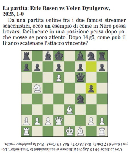 Da una partita online fra i due famosi streamer scacchistici, ecco un esempio di come in Nero possa trovarsi facilmente in una posizione persa dopo poche mosse se poco attento. Dopo 14.g5, come può il Bianco scatenare l’attacco vincente?