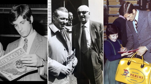 Dall’album dei ricordi della Panini: Gianni Rivera con l’album Mexico ‘70, Giuseppe con Enzo Ferrari e Facchetti in visita alla fabbrica di Modena