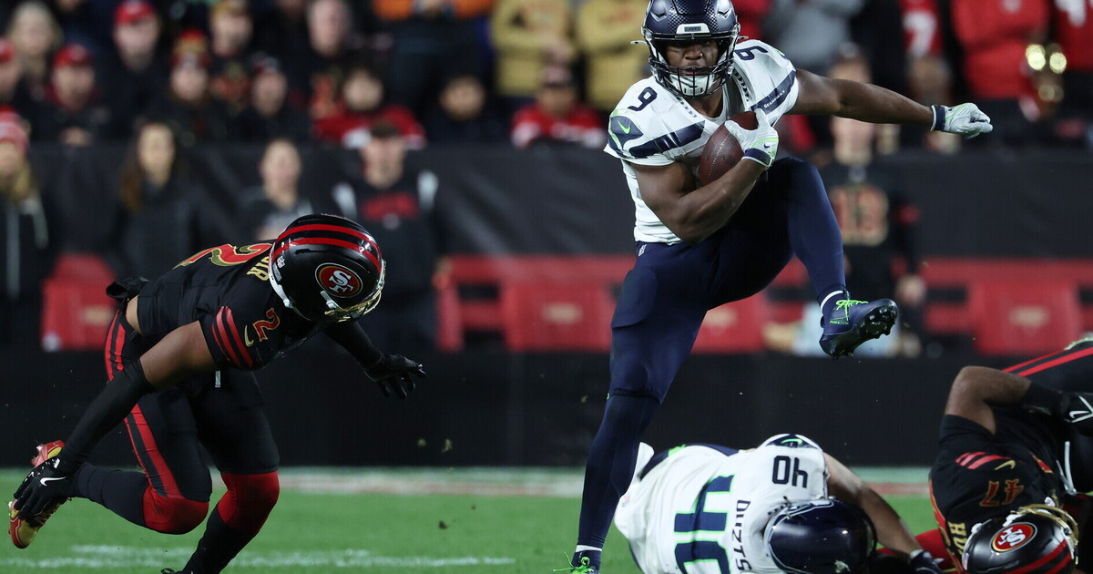 Il running back dei Seattle Seahawks, Kenneth Walker, supera il cornerback dei San Francisco 49ers, Deommodore Lenoir (foto Ap, via LaPresse)