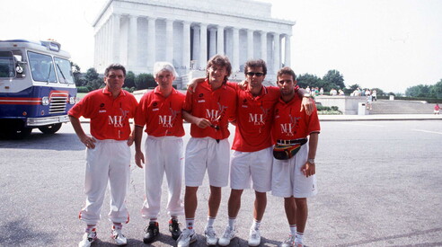 Franco Pagani è il secondo da sinistra (con i capelli bianchi). Alla sua destra l’altro fisioterapista Bertassi e alla sua sinistra Nava, Savicevic e Simone (foto Studio Buzzi)