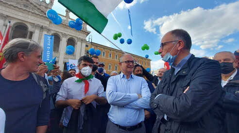 Il racconto Landini è il sacerdote del nuovo centrosinistra XXL: da Vendola a Di Maio A piazza San Giovanni la grande manifestazione organizzata dalla Cgil riunisce i big del nuovo Ulivo: da Letta a Conte, da Speranza a Bonafede. Si vede anche Gualtieri, l'ultimo ad andarsene. Taverna assicura che lo voterà 16 OTT 2021