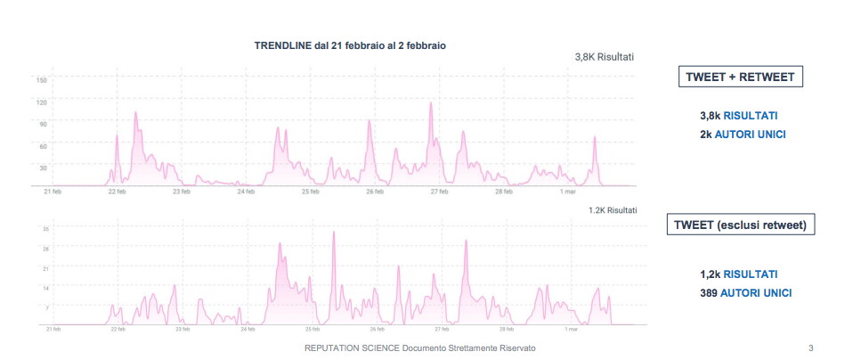 Come analizzato da Reputation Science il primo trend dell’hashtag #IoStoConPutin che tiene in considerazione i tweet e le ricondivisioni arriva a un totale di circa 3.800 contenuti e 2.000 utenti unici, il secondo che calcola solamente i post esclusi i retweet arriva a un totale di oltre 1.200 risultati e 389 autori unici. Mentre la minore esposizione dell’hashtag nella giornata, come è possibile osservare dal grafico sottostante, è del 23 febbraio, invece l'esposizione massima si ha domenica 27 febbraio.